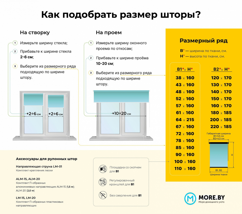 Общая информация: В нашем каталоге представлены рулонные шторы разной ширины, например 52*160, размер в см. Так вот 52 см - это ширина полотна. Еще необходимо прибавить 2 см в право и 2 см в лева на механизм крепления.